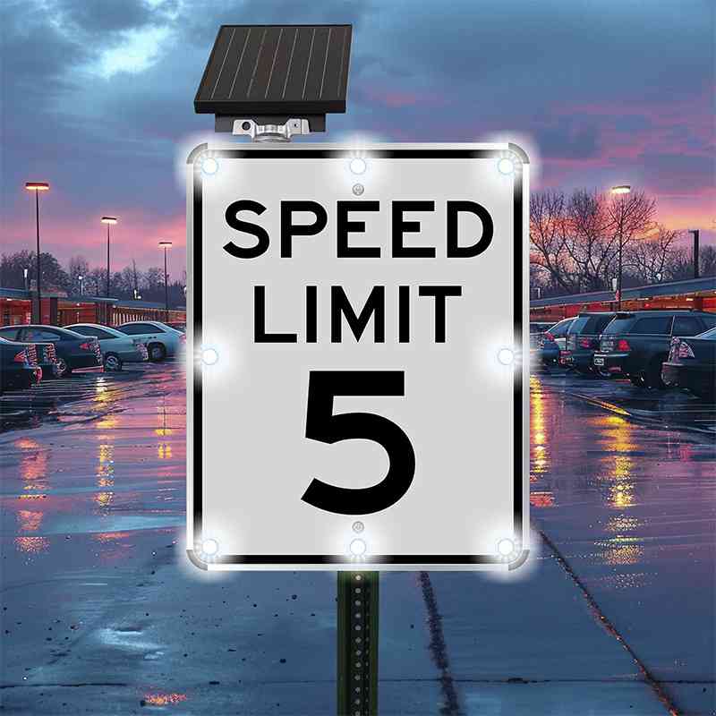 Our 5 MPH LED Solar Speed Limit Sign is designed to increase awareness in areas with low-speed requirements, such as parking lots or school zones. The bright LED lighting maximizes visibility and promotes safe driving practices. Constructed from durable materials, this sign is built for reliable performance.