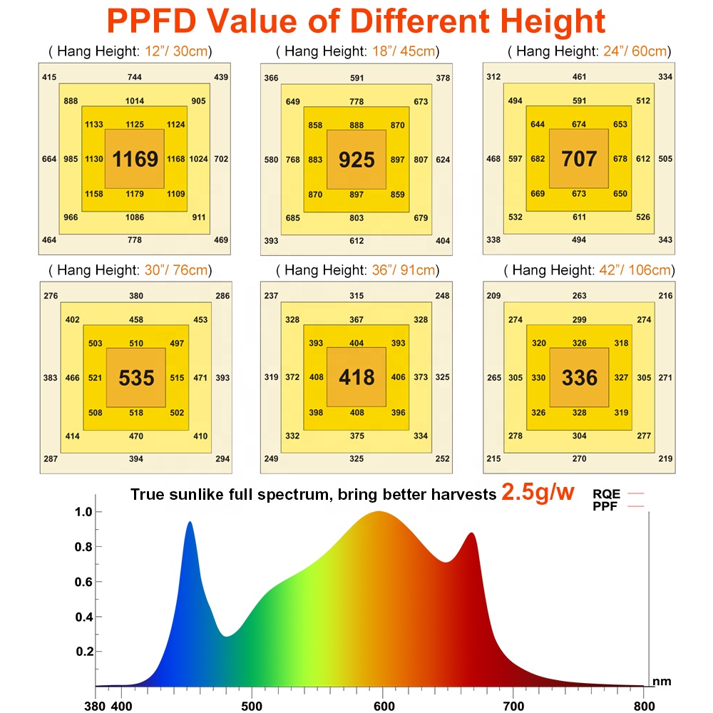 4. Lower operating cost and higher output, can provide strong light output and uniform canopy penetration, so as to obtain the maximum higher output. The footprint of vegetables is 3 x 3 feet, and the footprint of flowers is 2 x 2 feet. The multi-light connection with unified dimming function is particularly conducive to large-scale indoor and commercial planting.