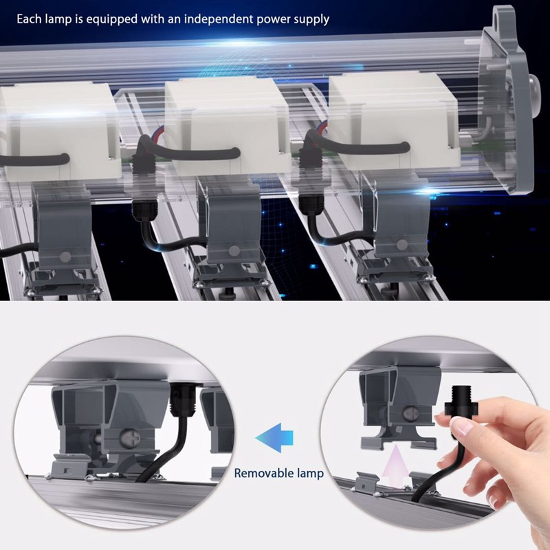 3. High reflection and no noise-the design of the fanless LED growth system will make your growth life easy, quiet, and the fast heat dissipation aluminum material reduces the light loss on the channel and the wall, and increases the light intensity by 20%. Your plants get more energy without burning plants to get the most space, suitable for large rooms and commercial places.