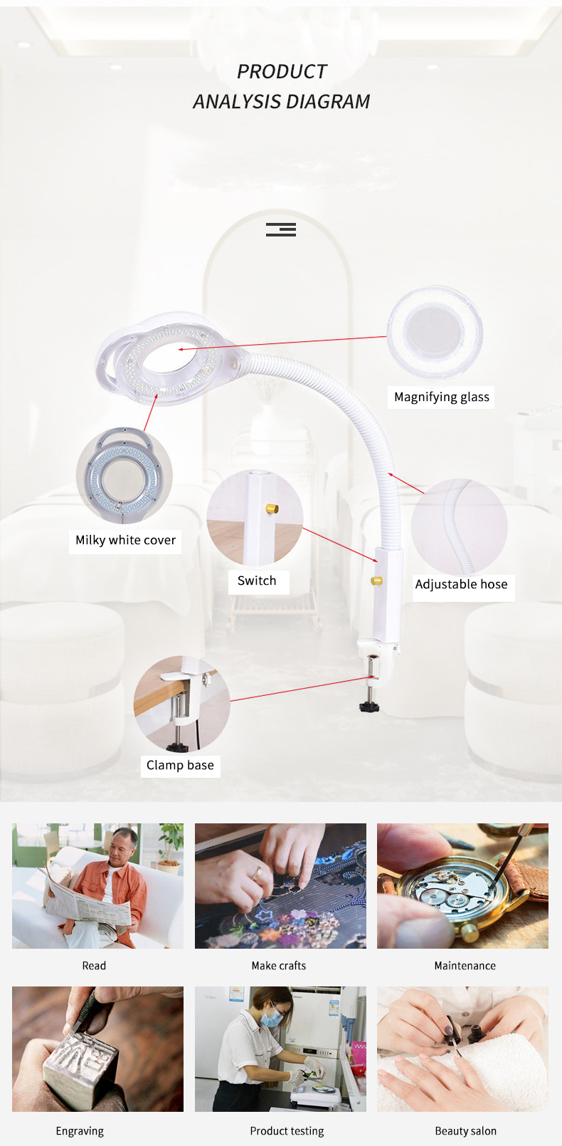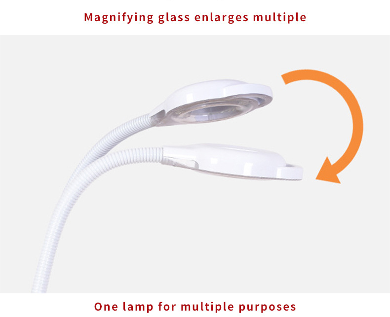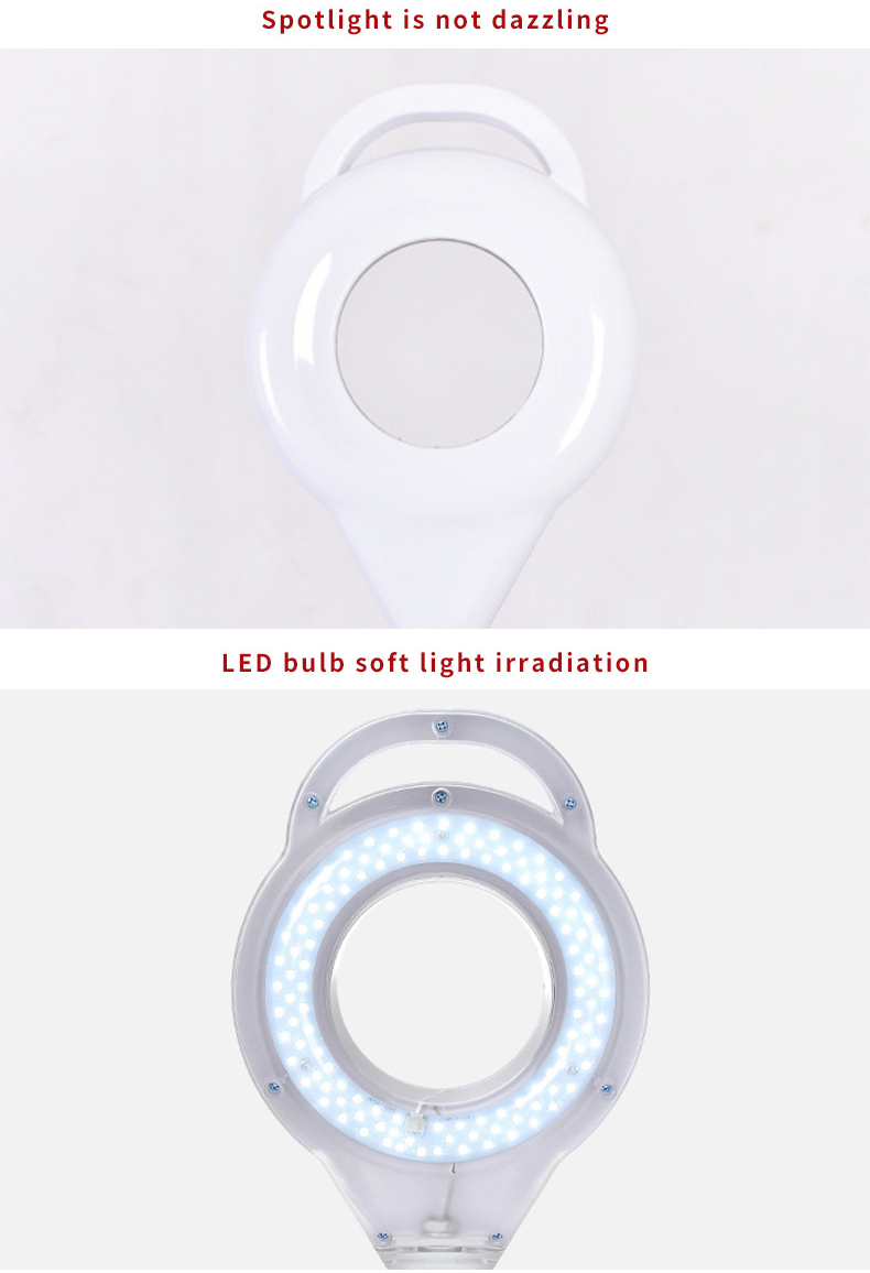 1. Dual-purpose design: It is both a magnifying glass (for delicate operations such as manicure, eyelash grafting, skin care, etc.) and an LED lighting lamp (provides shadowless fill light).