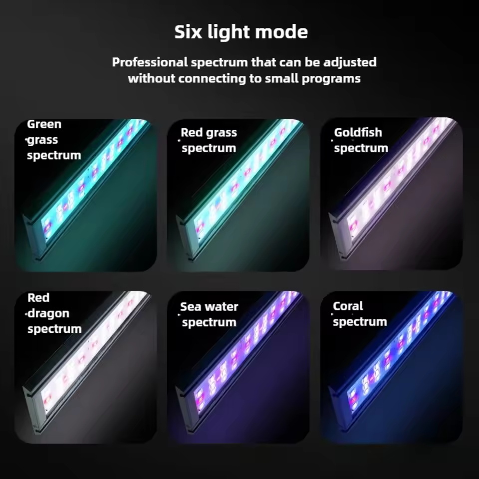 1.Support sunrise and sunset mode, custom spectrum intensity (such as enhancing red/blue light separately), adapt to different aquatic plant stages (such as Dutch red grass needs strong red light).