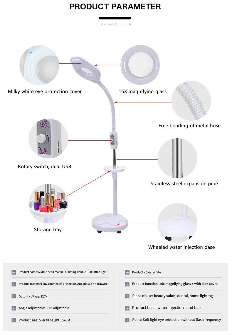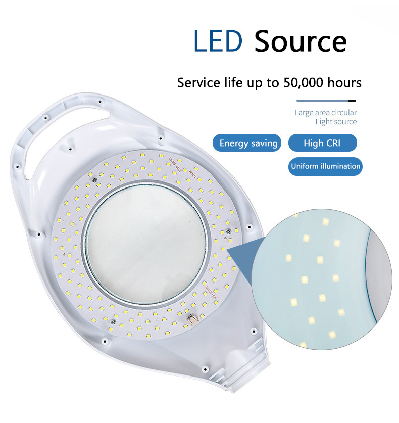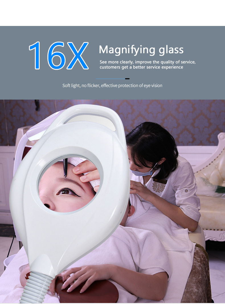This 16x magnifying glass LED lamp is designed for beauty salons. It integrates high-brightness LED lighting and magnifying glass functions. It is suitable for fine beauty operations such as eyelash extension, micro plastic surgery, skin care, etc. The 38W ring LED lamp provides uniform and shadowless lighting, ensuring clear visibility of the operation area and improving the work efficiency and accuracy of beauticians.
