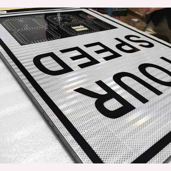 - Radar speed signs feature MUTCD-conforming white HIP reflective sheeting on sign face with black text.