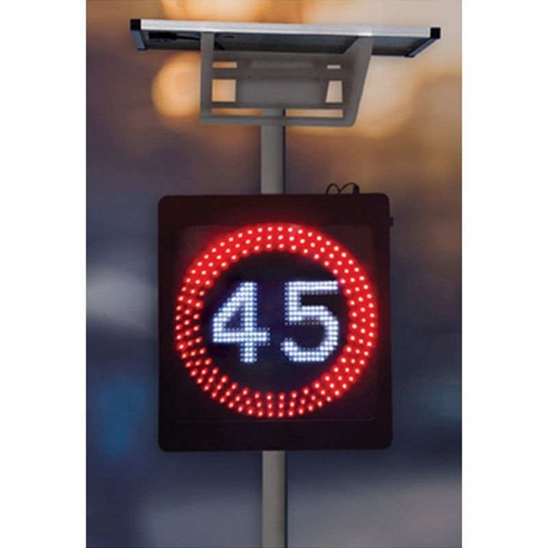 The Solar variable speed limit sign utilises ultra-bright, high quality and long-life LED technology to provide a highly visual, animated enforcement of the designated speed limit with a proven ability to influence driver behaviour. The remote allows control over the full dot matrix display area to change the posted speed limit between 01 – 99 Km/h and the animation of the annulus (red rings) Typically installed in areas where vehicles are in close proximity to pedestrians such as school zones, construction zones, residential areas, and college campus. The unit is available in either a fixed or portable version. The minimal current draw allows the variable speed limit sign to be simply and effectively operated using solar energy. The auto dimming feature ensures consistency of LED brightness day or night and further conserves battery life.