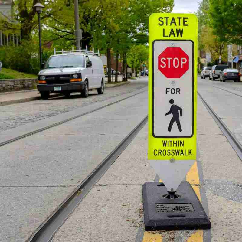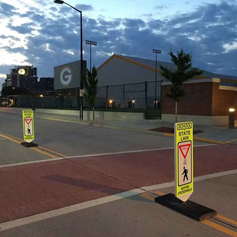 Help prioritize safety for all with our Lime State Law Stop For Pedestrian Within Crosswalk Vertical Panel. Its bold lime color and clear message ensure visibility, reducing accidents. Durable for outdoor use, it’s ideal for various traffic control needs.