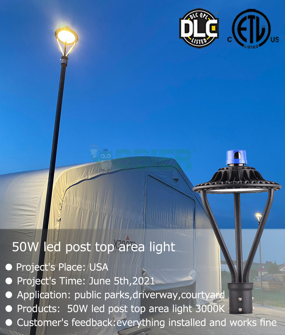 Post Top light from Bbier lighting is available in 30w 50w 75w 100w 150w for decorative lighting wherever you need it. The post top light can be widely applied to pathway, walkway, driveway, road, street, yard, farmyard, park, garden, playground, school, store, parking lot or other outdoor area. ETL DLC Listed with 5 years warranty and IP65 waterproof for drying, wet environment.